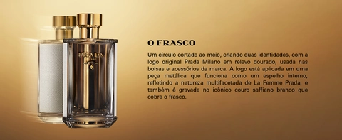 Sobre o frasco de La Femme Prada: Um círculo cortado ao meio criando 2 identidades, possui a logo institucional Prada Milano, usada nas bolsas e acessórios da marca. Além disso, o frasco é coberto com couro saffiano branco, aplicado em uma peça de metal presa no vidro, atuado como um espelho dentro do frasco. A tampa é dourada, gravada com a estampa do couro saffiano nas laterais e com a logo de Prada no topo.