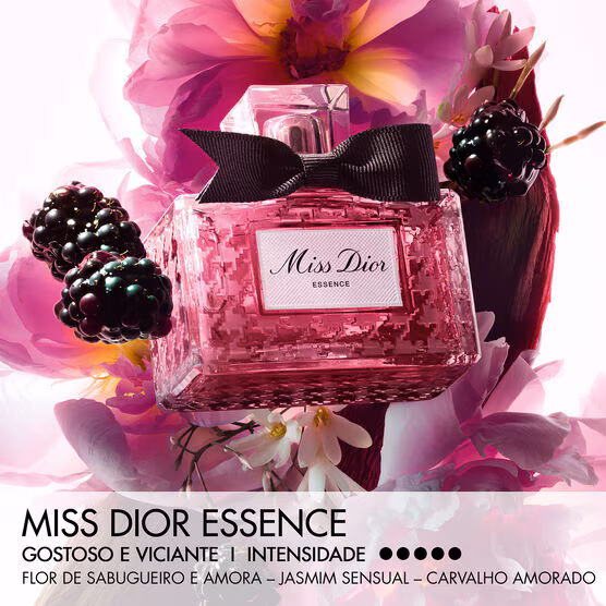 Miss Dior Essence é uma fragrância concentrada que imprime uma trilha intensa e sofisticada: suas notas de geleia de amora (blackberry) e flor de sabugueiro abrem o perfume com um acorde gourmand, doce e ao mesmo tempo fresco.