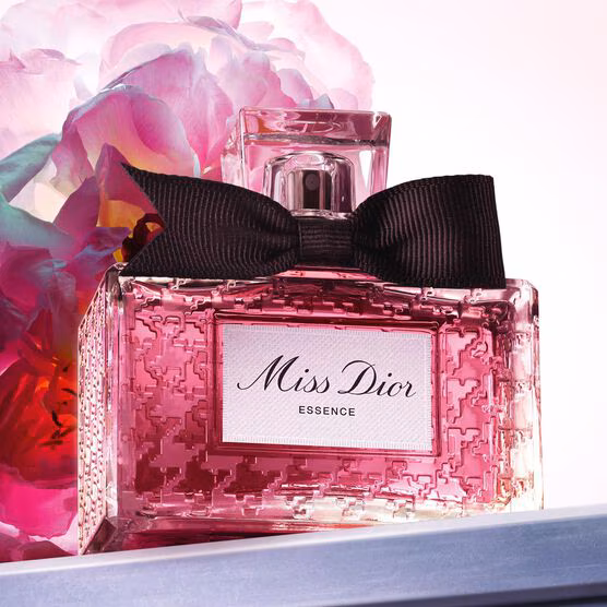 O frasco de Miss Dior Essence presta homenagem ao legado da marca: inspirado no design original de Christian Dior em 1948, ele ostenta o padrão pied-de-poule fosco e é adornado por um laço em gorgorão preto ao redor de uma tampa de vidro preciosa. Essa estética minimalista e ao mesmo tempo icônica reforça o caráter elegante e histórico da fragrância.